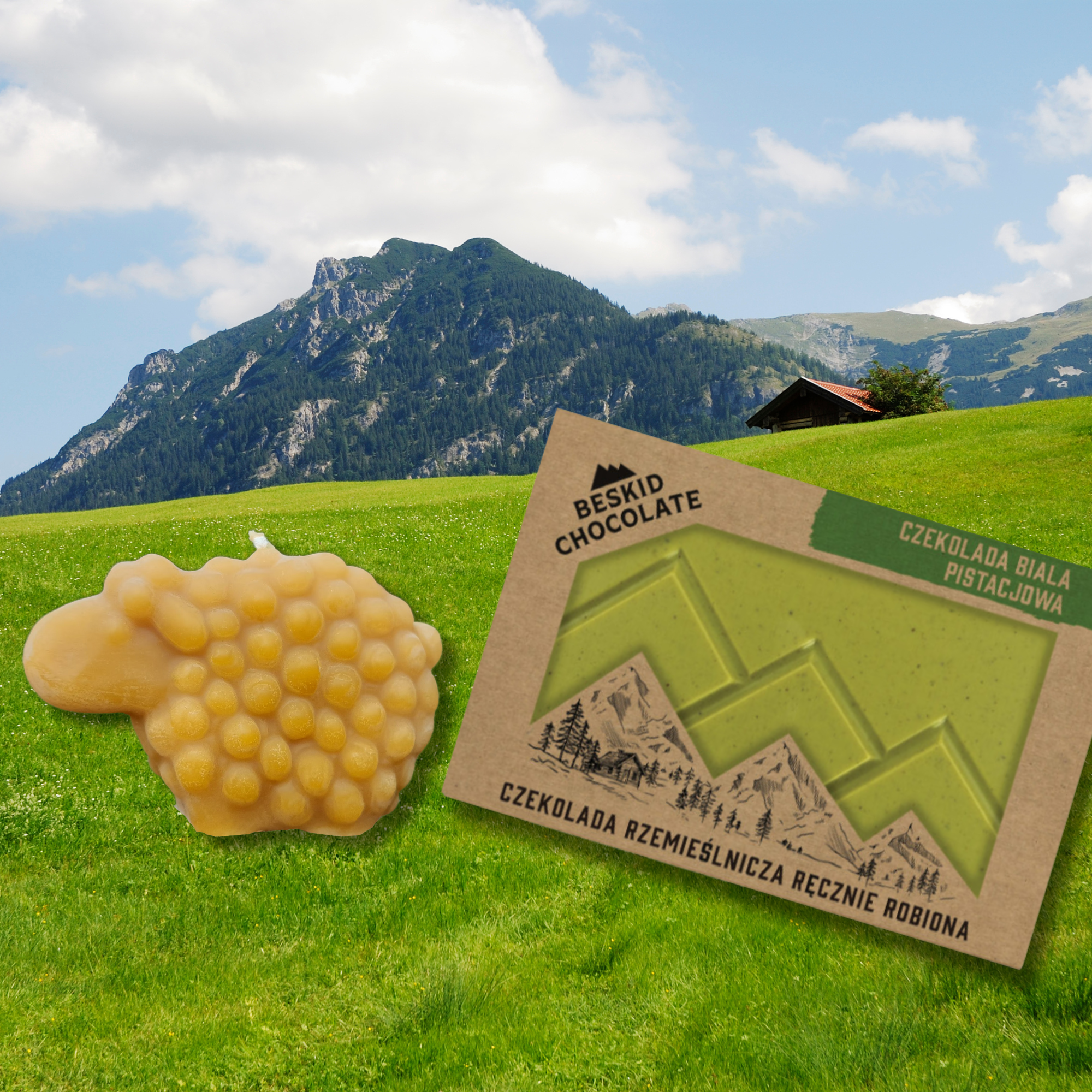 Zestaw prezentowy „Owca na wypasie” – świeca Owieczka & rzemieślnicza czekolada
